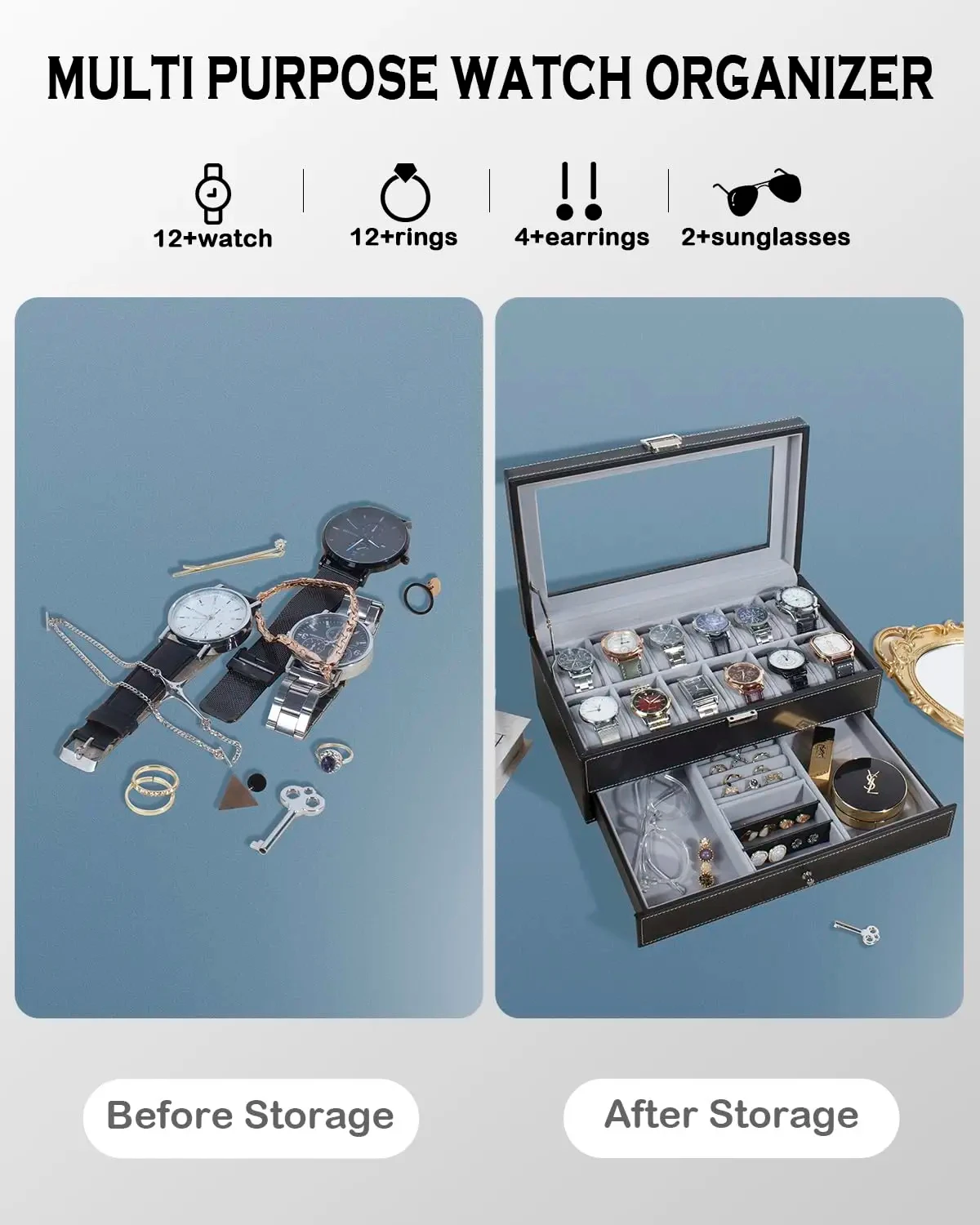 • 【Dual Storage】This 2-tier watch box comes with 12 individual watch slots and removable pillows. The bottom drawer is equipped with different sections with enough space for key cufflinks, necklaces, bracelets, earrings, brooches, glasses and other jewelry items.
