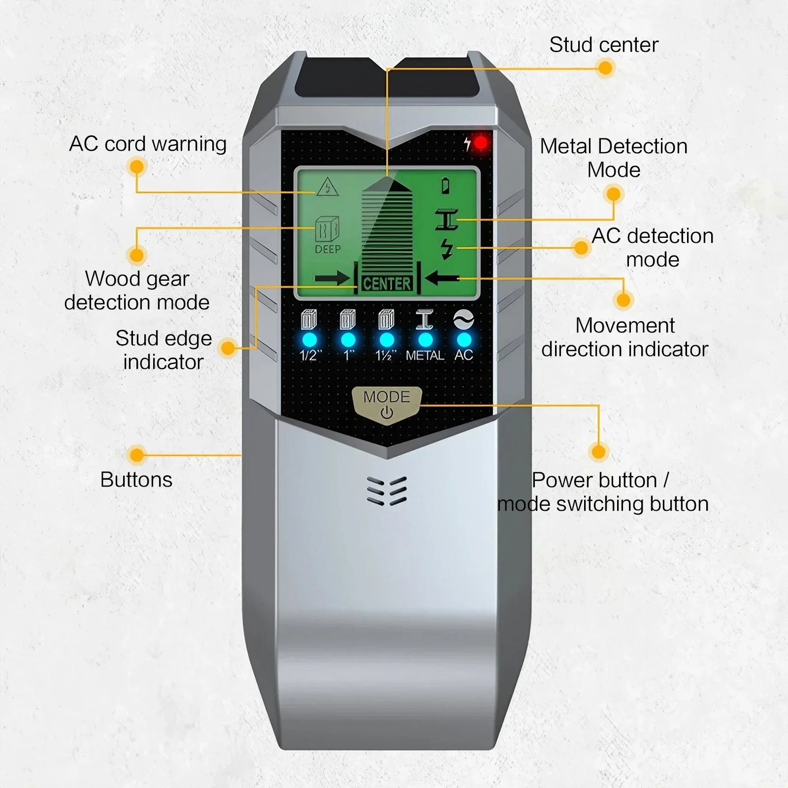 - The 5in1 Wall Metal Detection Instrument is capable of detecting various materials such as metal, wires, and wood.