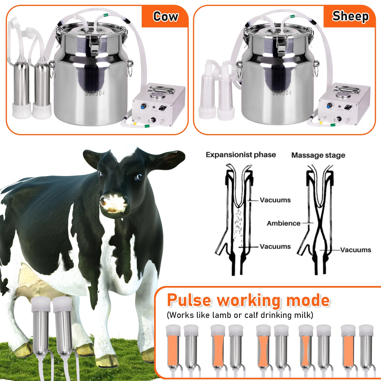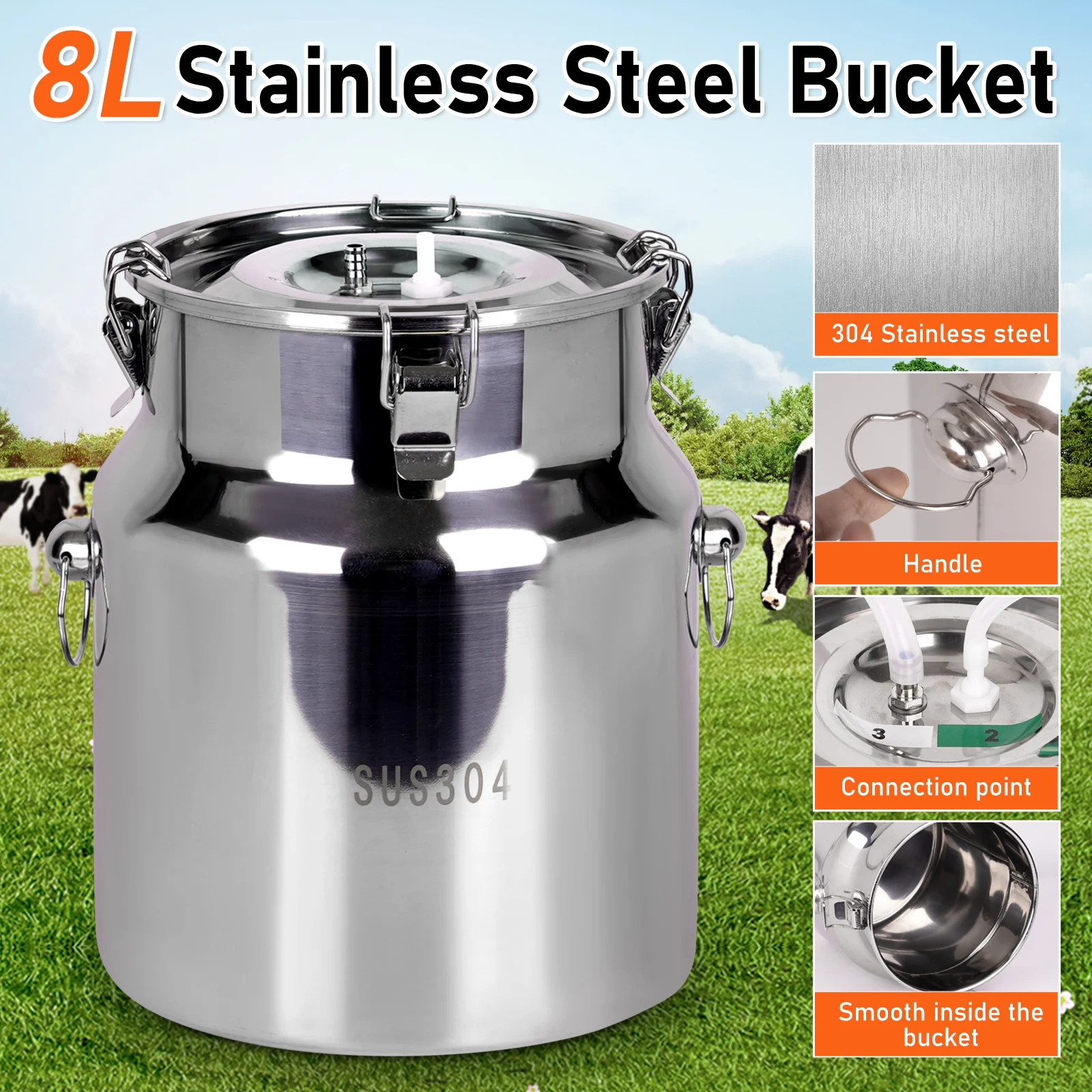 The 8L Electric Milking Machine for Cow Goat is an innovative and efficient device designed for the task of extracting milk from dairy animals. It incorporates a hollow 8-liter stainless steel pail, also known as a milking bucket.