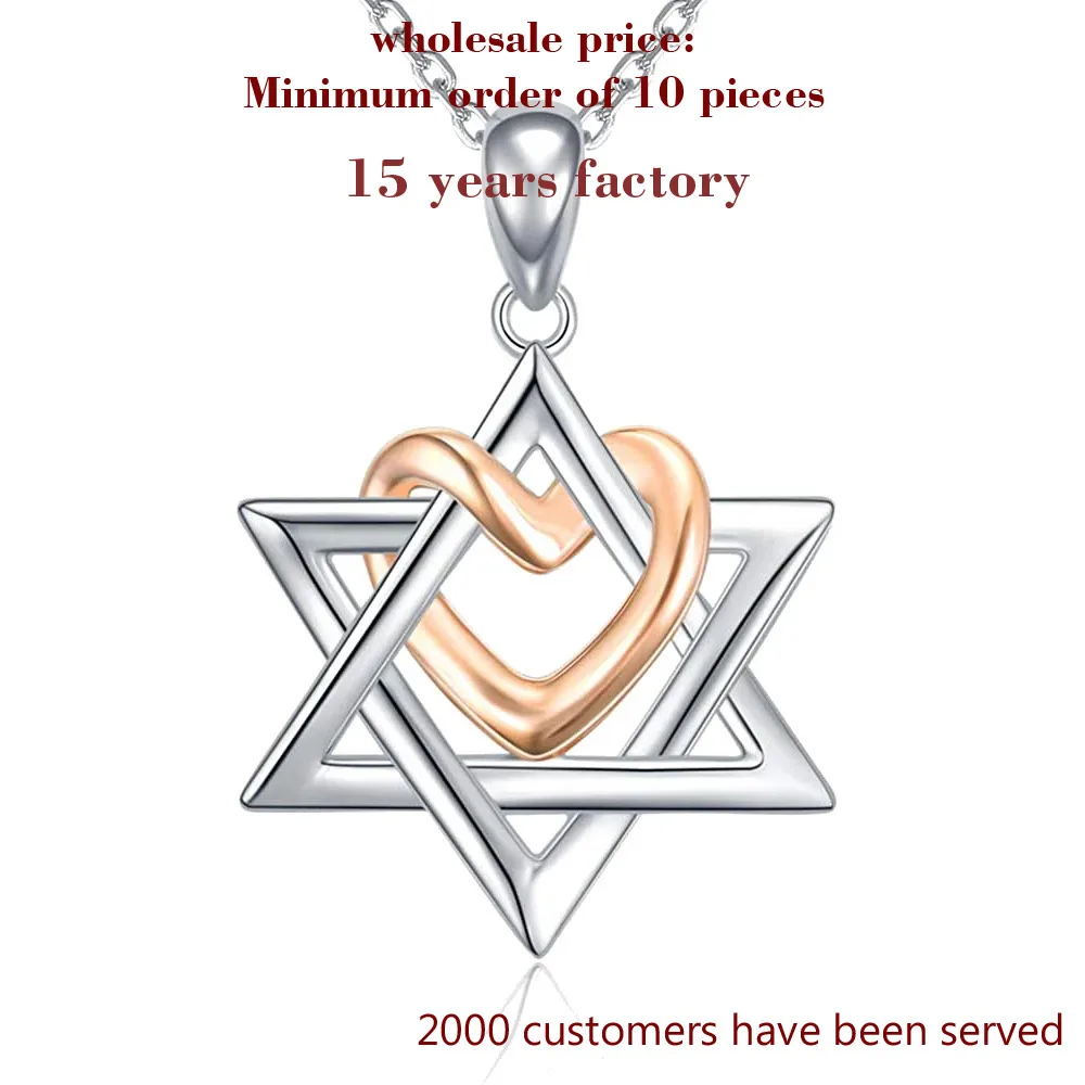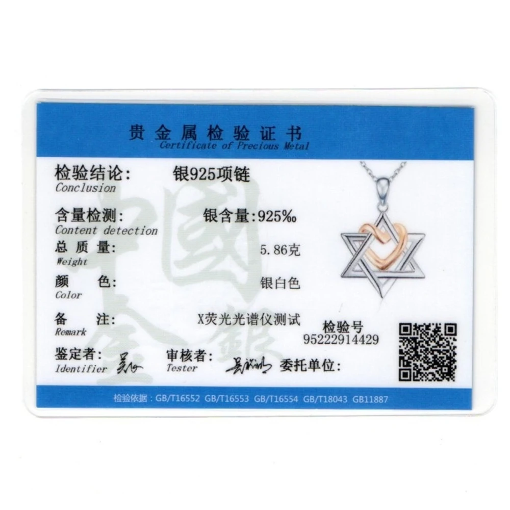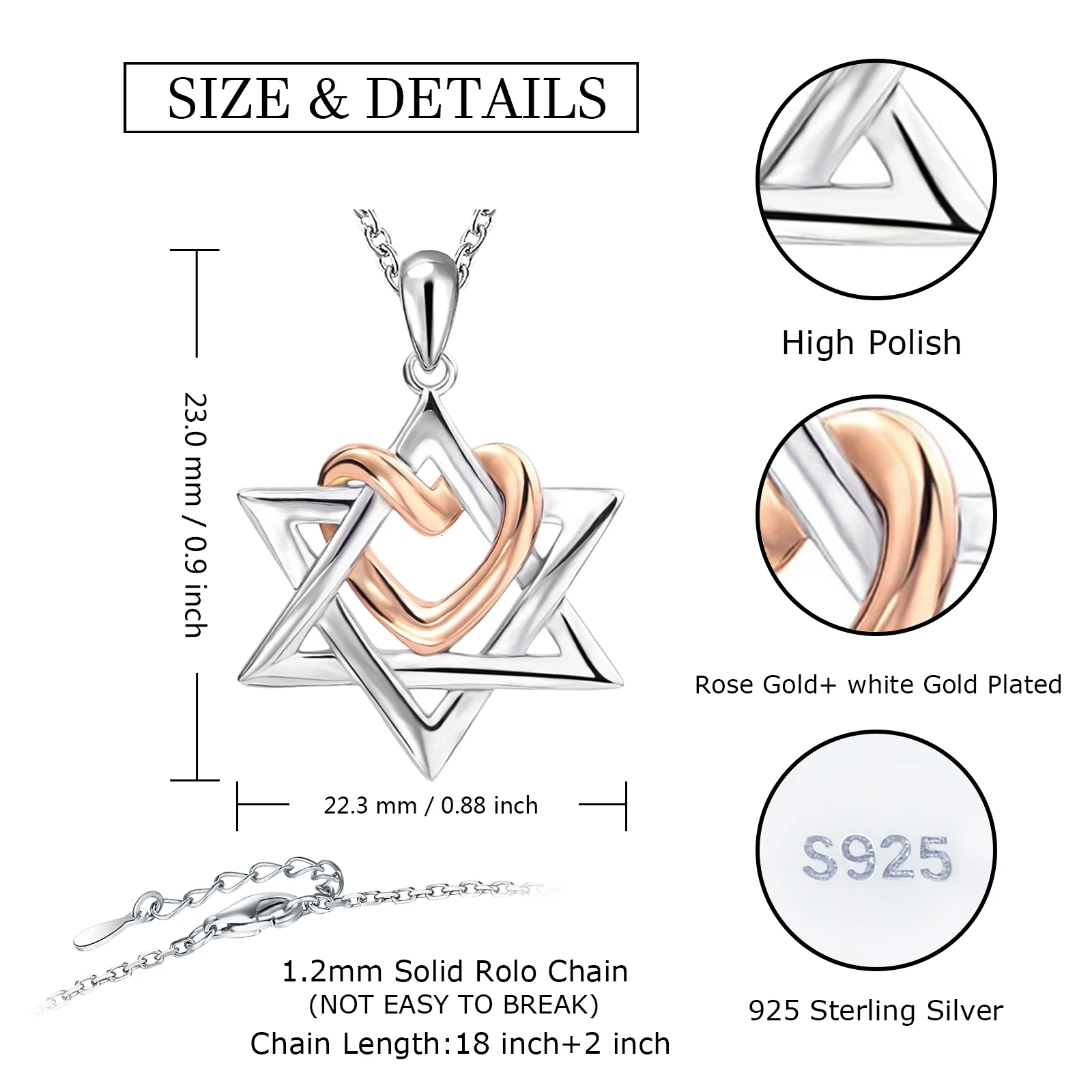 The 925 Sterling Silver Star of David with Rose Gold Color Love Heart Pendants & Necklaces is a dazzling piece of jewelry, reflecting a blend of tradition and style. The Sterling Silver Star of David carries a deep significance connected to Jewish culture, representing protection and Jewish identity. Carved from 925 sterling silver, the pendant emits a bright and robust aura, making it a valued possession.