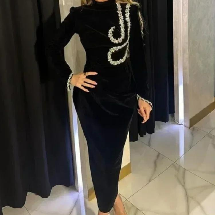 Black Slim and Slim Beaded Long Sleeve Bandage Dress Long Dress Maxi Dresses for Women