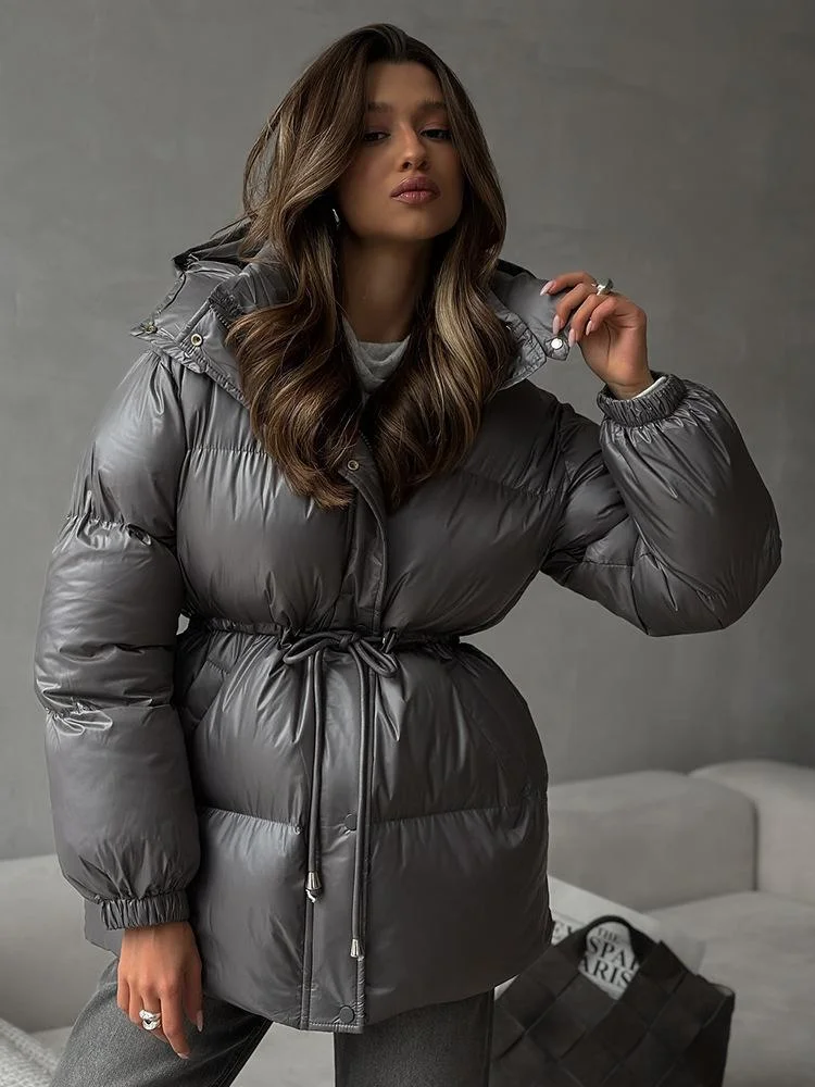 Casual Waist-cinching Thicken Cotton Coat Women Fashion Hooded Zipper Lace Up Long Sleeve Coats 2025 Winter Warm Lady Outerwears