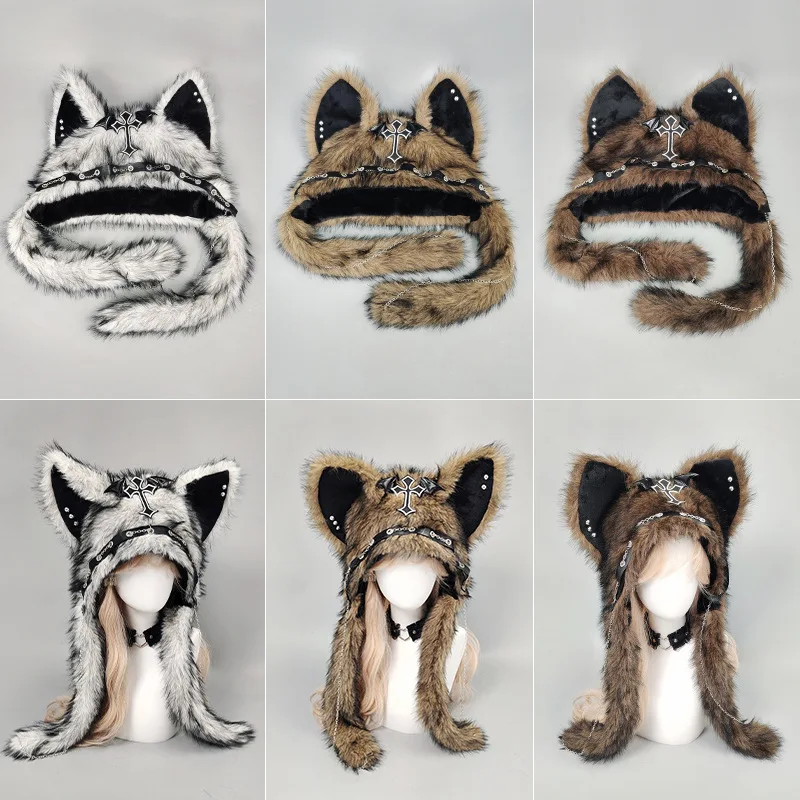 Dark Series Gothic Plush Hat Y2K Cross Metal Style Headwear Cosplay Cat Ear Hat Halloween Punk Rock Warm Cap for Women Men Child
