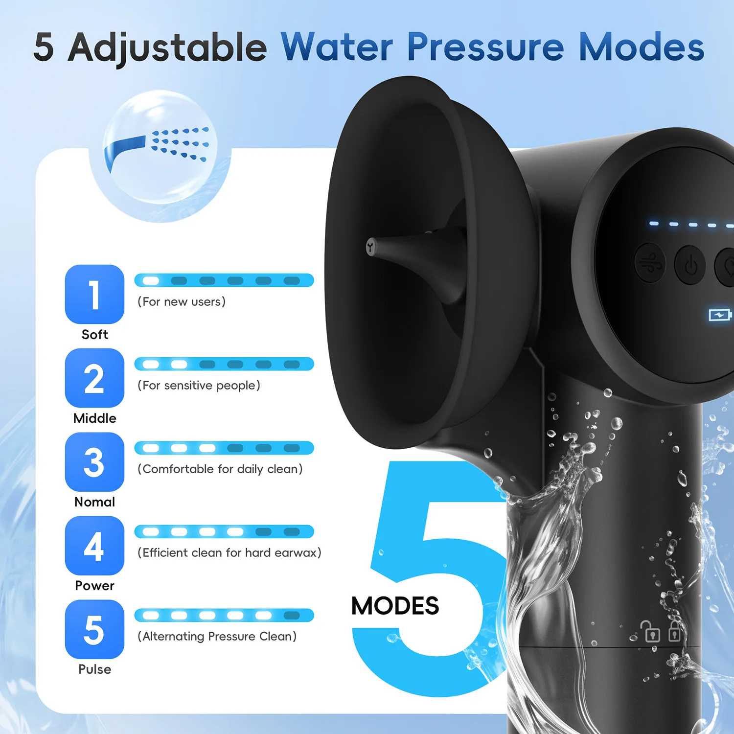 【5 modes selection】: Our electric ear cleaner offers five different pressure intensities (Normal, Gentle, Strong, Ear Bath, Pulse) to ensure thorough rinsing while protecting your ear canal. Simply select the appropriate intensity for a comfortable rinsing experience.