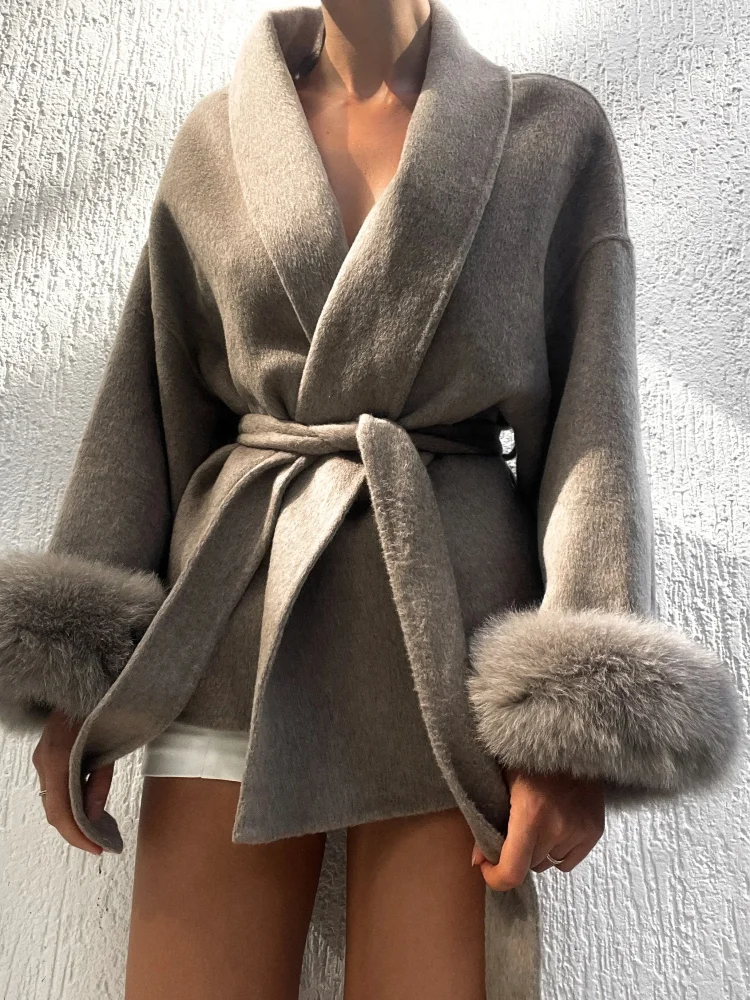 - It comes with a furry belt, adding to the overall elegant aesthetic of the coat.