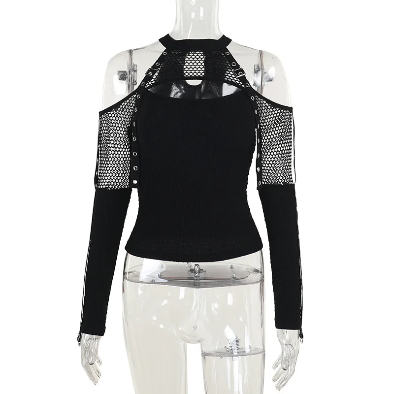 Even though designed for the autumn season, this streetwear T-shirt is versatile enough to incorporate into different seasonal wardrobes. It invites the wearer to experiment with various layering techniques to create countless unique looks. The Goth Dark Punk Grunge Fishnet Patchwork Off Shoulder T-shirts Trim Corn Strap Halter Tops confidently encourages you to embrace your distinct style.