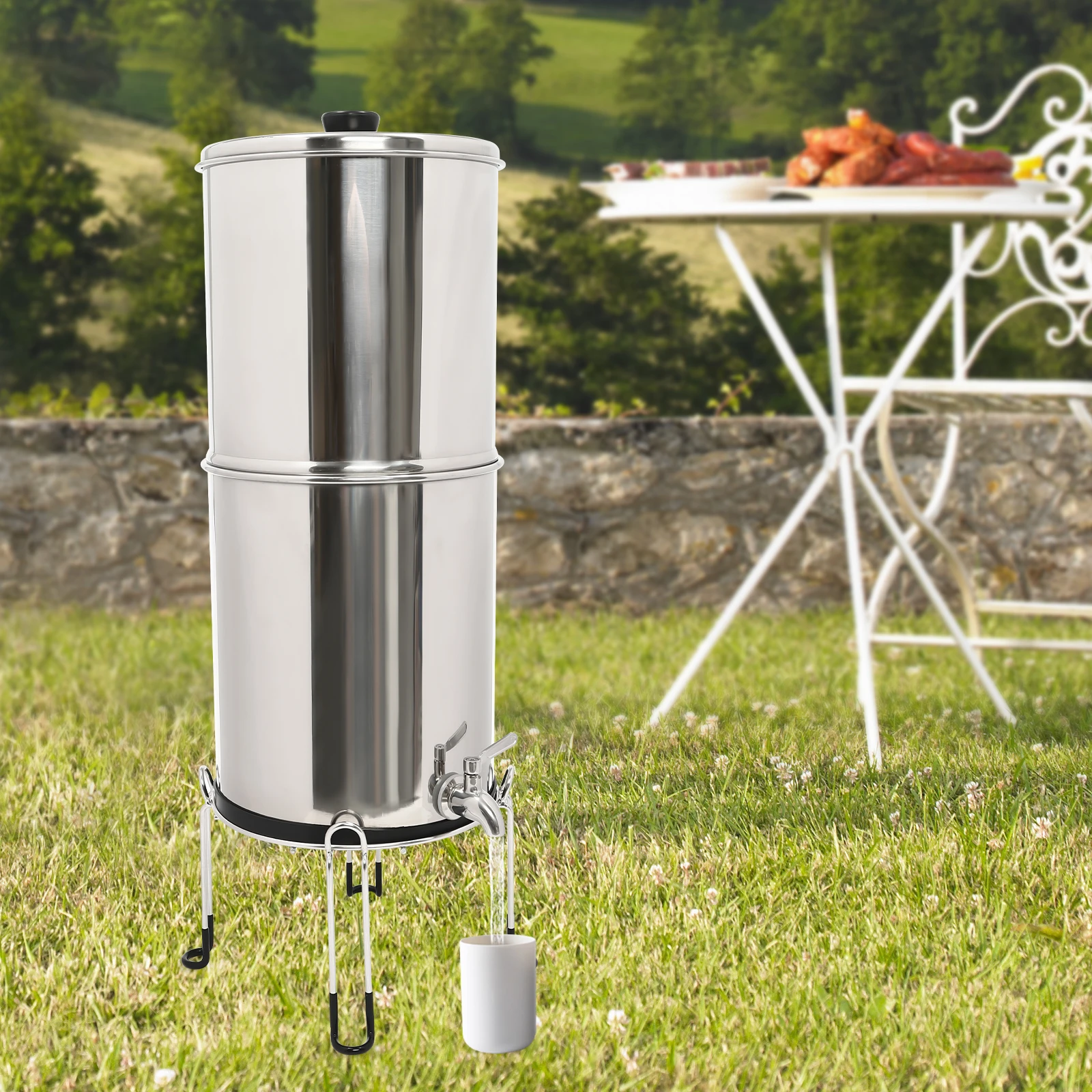 The gravity-fed water filter system removes suspended solids, turbidity, parasites, disease-causing bacteria, residual chlorine, and more to provide great-tasting water for the whole family. It is also a highly efficient water filter that does not require electricity and utilizes gravity, making it ideal for those who want to improve the quality of their drinking water with a highly portable, easy-to-use system.