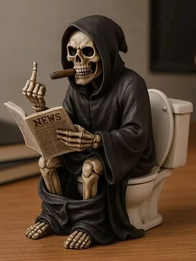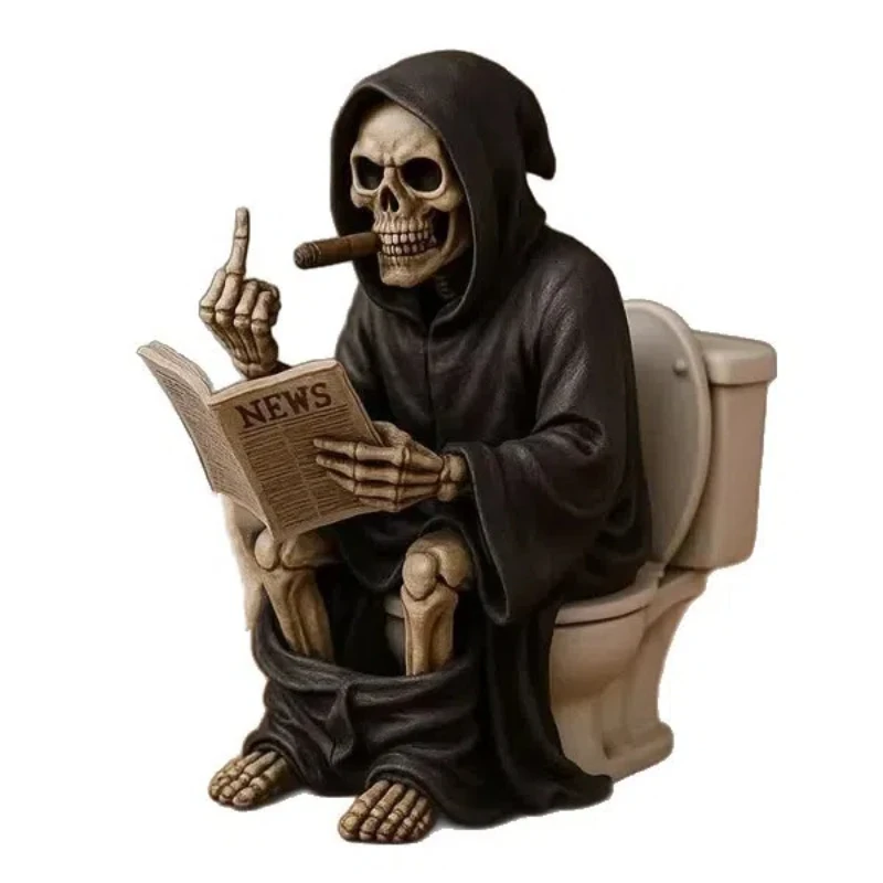 The Halloween Toilet Grim Reaper Figurine is a unique and daring piece of home decor. Crafted from durable resin, it embodies both whimsy and macabre aesthetics. The figurine depicts the Grim Reaper, a traditional symbol of death and the afterlife. However, the Grim Reaper isn’t just your regular harbinger of doom seating on a toilet, it also carries a playful twist as it holds up a middle finger, injecting a dose of humor and irreverence into the well-known representation.
