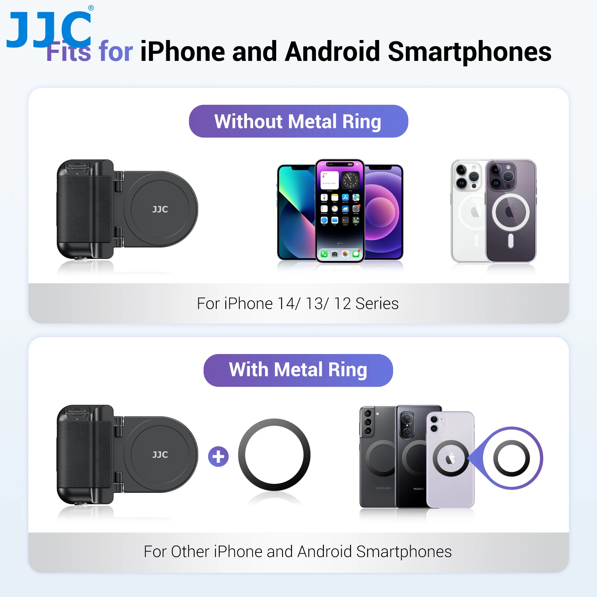 3. Non-MagSafe phones (e.g., iPhone 11 series and earlier, other Android phones, or phones with non-MagSafe case) using the included traceless 3M adhesive metal ring.