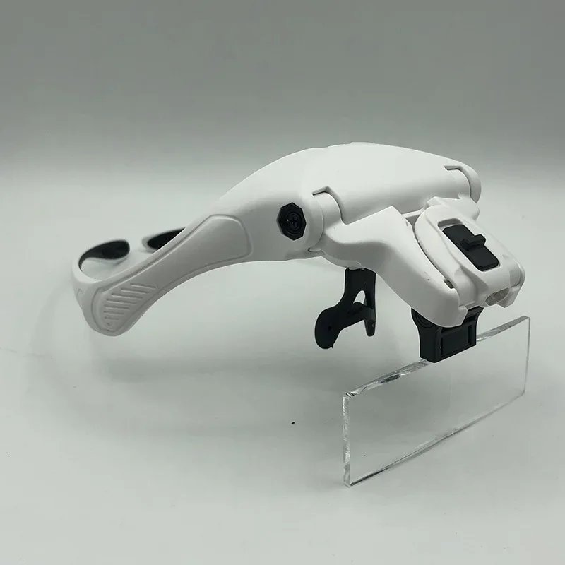 The magnifying glass is designed to be worn on the head with a headband, freeing up the user’s hands.
