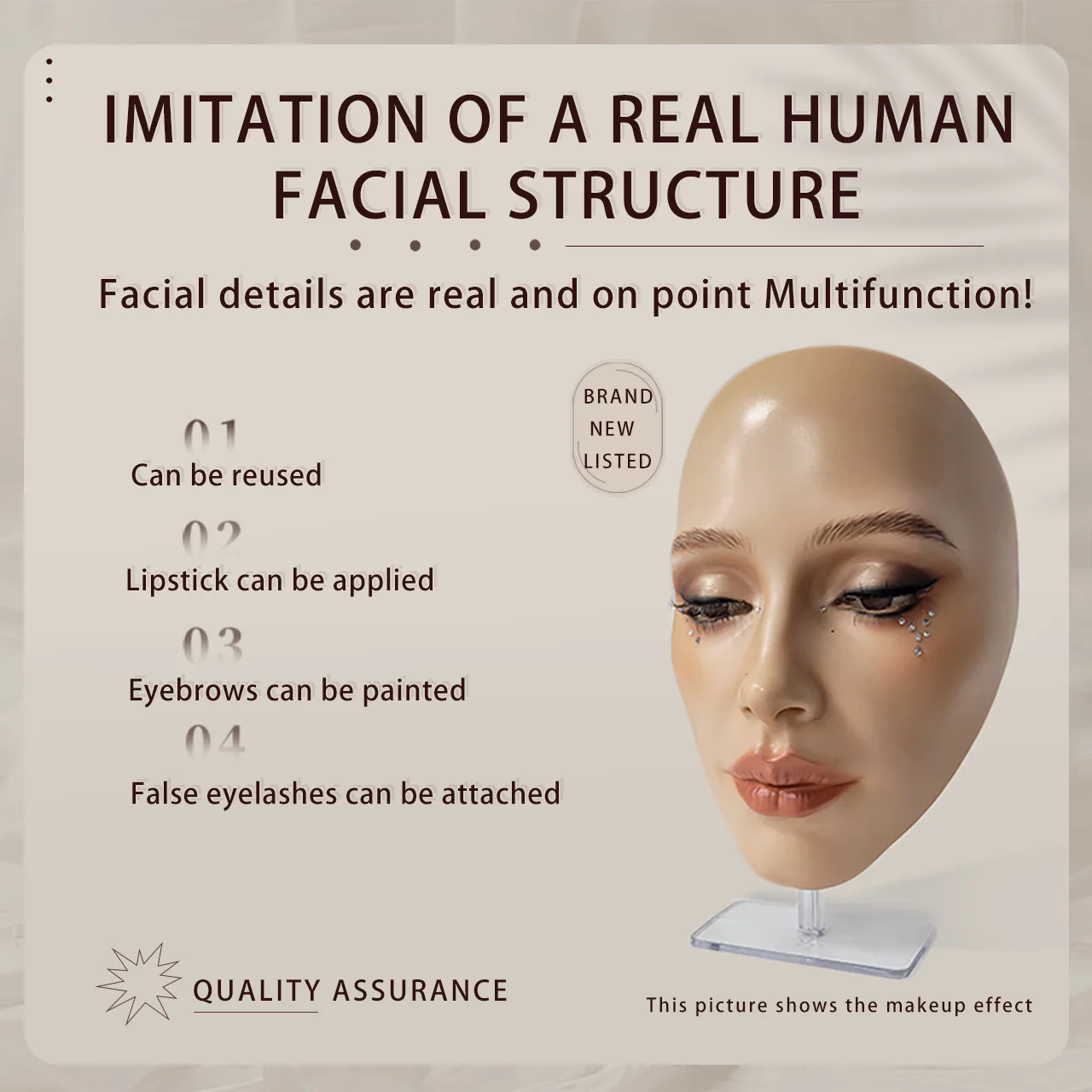 • The material used for the model is bionic-like, enhancing the realness of skin for makeup application.