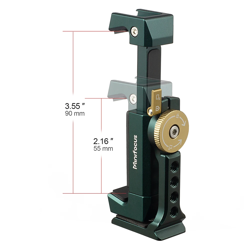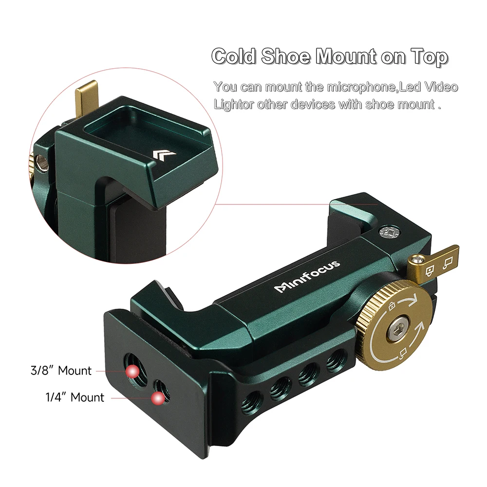 Metal phone tripod mount with Cold Shoe for 360 degree shooting! “L“-shaped cell phone bracket, unique 360° rotation design, allows you to rapidly switch in horizontal and vertical shapes and other different shooting angles can be adjusted as you like.