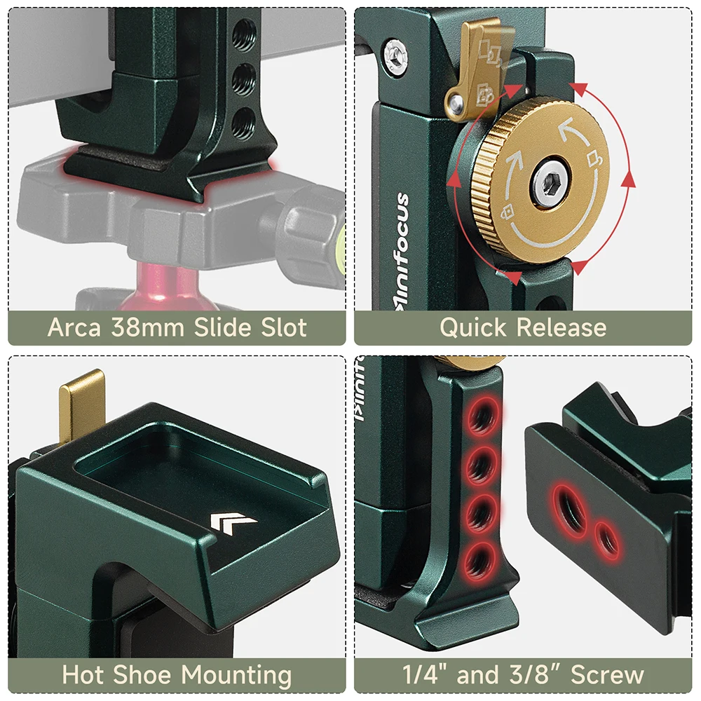 With cold shoe mount on top ,you can mount the microphone or LED light,Best partner for video shooting.base of this clamp mount is a very convenient Arca Swiss compatible “foot”, making it easy to pop on an Arca Swiss tripod or other support.