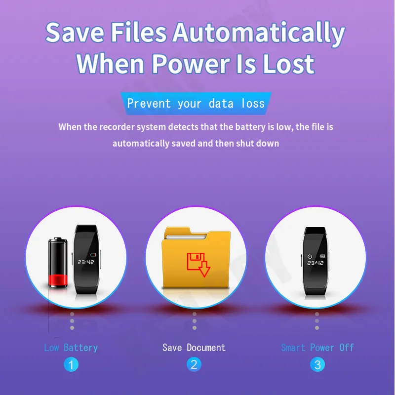 When the recorder system detects that the battery is low, the file is automatically saved and then shut down