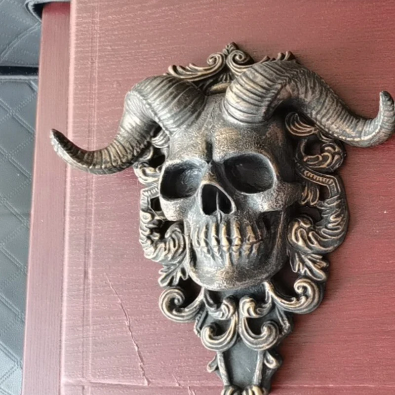 The Modern Art Door Ring Hell Demon Horned Skull Hanging Door Knocker is a uniquely designed piece that exudes a bold and striking aesthetic. This heavy-duty gothic doorknocker painstakingly captures and invokes the imagery of a horned demon skull – veins, ridges, and all, creating an awe-inspiring sight for anyone who chances upon it. Constructed with meticulous precision, each detail of the skull – from its sinister hollow eyes to its devilish horns – is vivid and intricately carved to exude an enigmatic, gothic vibe. But it’s not just the aesthetics that warrant praise; this doorknocker also boasts remarkable functionality, carrying enough weight to create a resounding knock. The ring, formed through the demon skull’s mouth, swings freely and seamlessly, ensuring a reliable performance each time it’s used. The Modern Art Door Ring Hell Demon Horned Skull Hanging Door Knocker is not an ordinary doorknocker—it is a piece of art, a conversation starter, and a symbol of an individual’s unique taste and bold spirit. It is a perfect accessory for those who are passionate about unique home décor pieces and are unafraid to express their individuality.