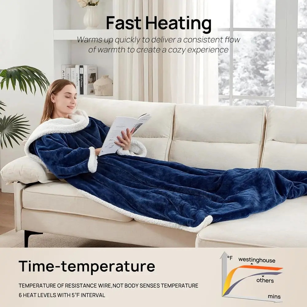 Navy Electric Throw Blanket with Foot Pocket, 6 Heat Settings, 2-10 Hours Timer, 50×70+18, Wearable with Sleeves