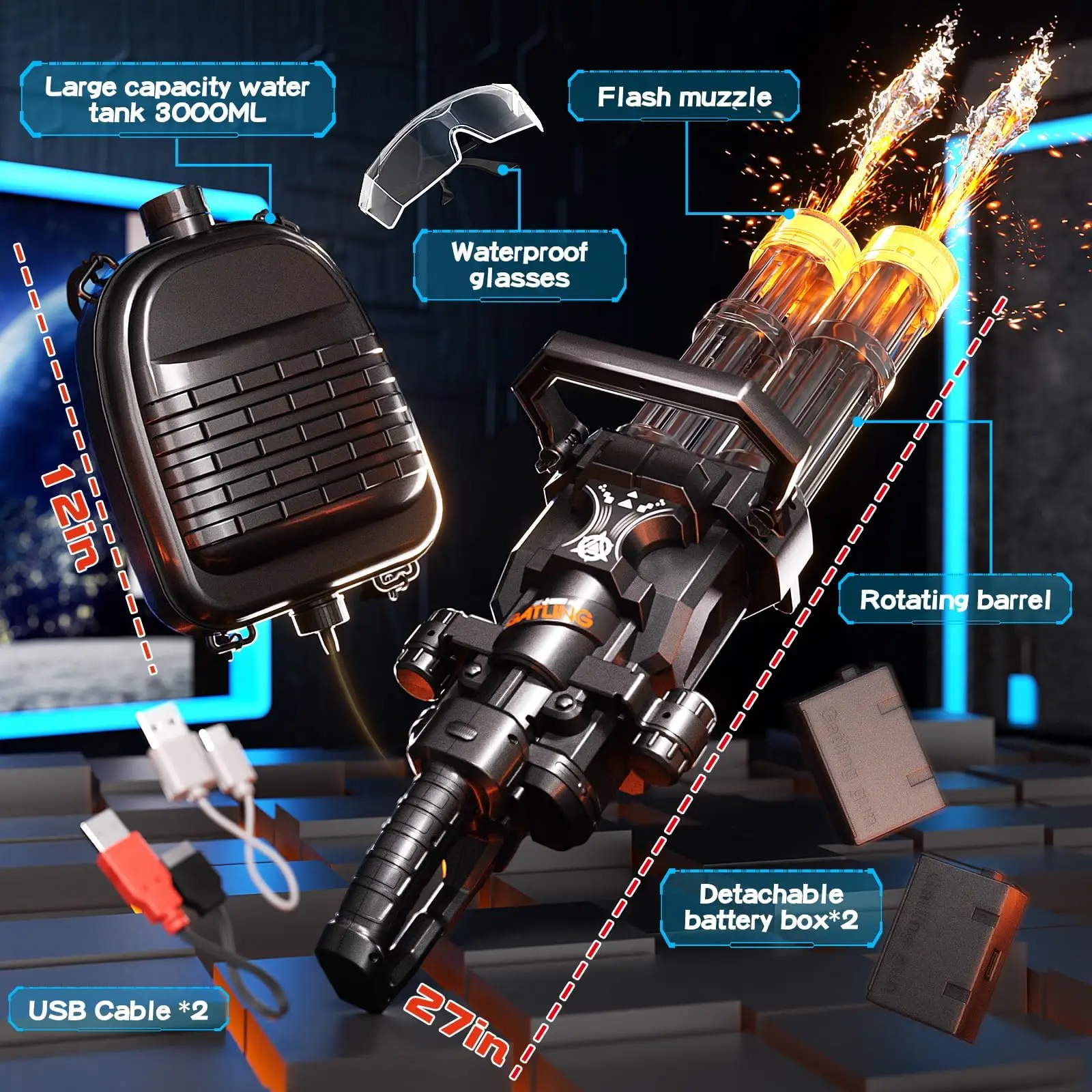 Strongest Electric Gatling Water Gun Toy Rotating Double Barrel With Big Capacity Backpack Outdoor Pool Toy for Kids Adult Gifts