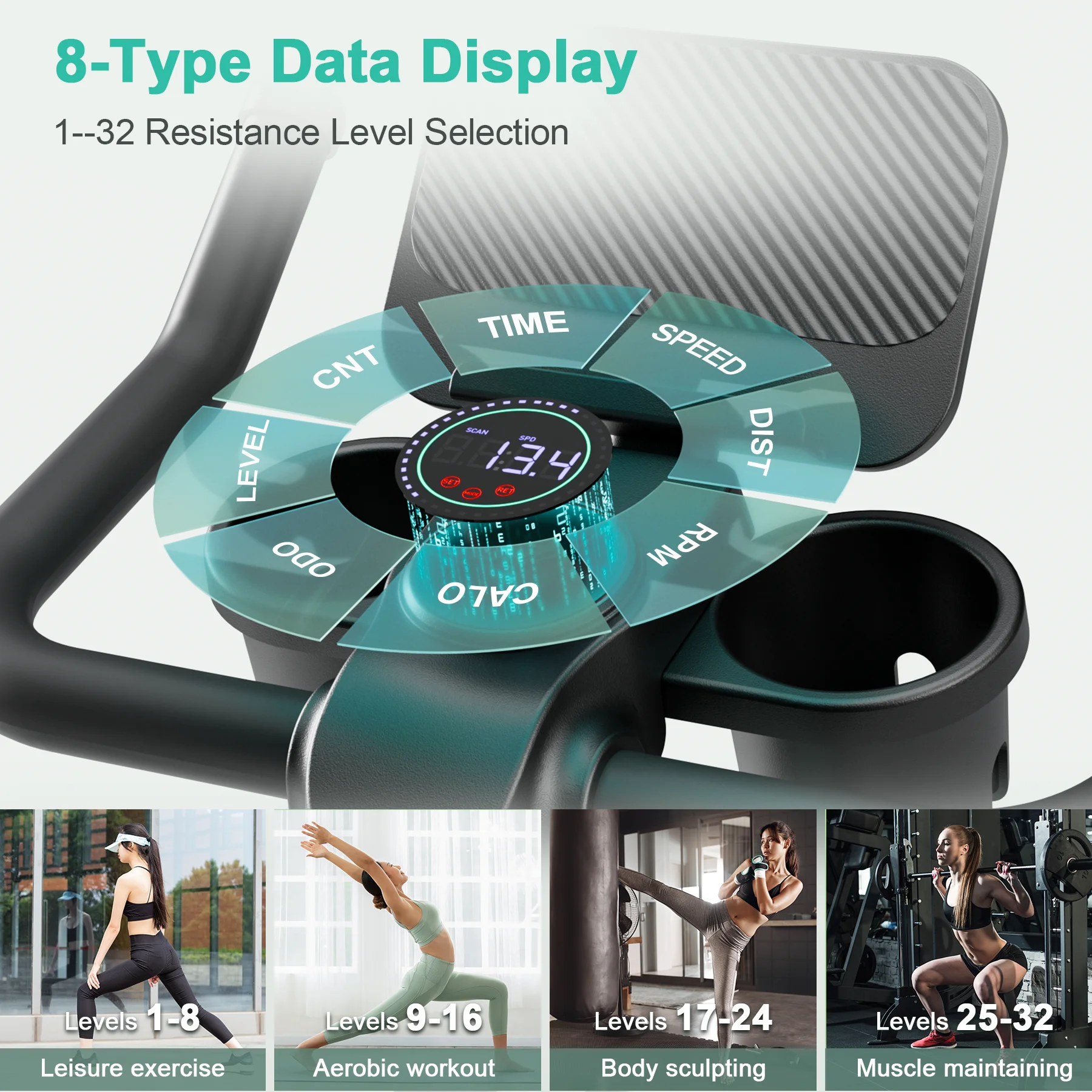 【32-Level Magnetic Resistance】 The spinning bike offers 32 levels of adjustable magnetic resistance, allowing precise customization to suit all fitness levels. The built-in LCD display tracks key workout metrics, including time, speed, distance, calories burned, RPM, ODO, and resistance level, keeping you informed and motivated