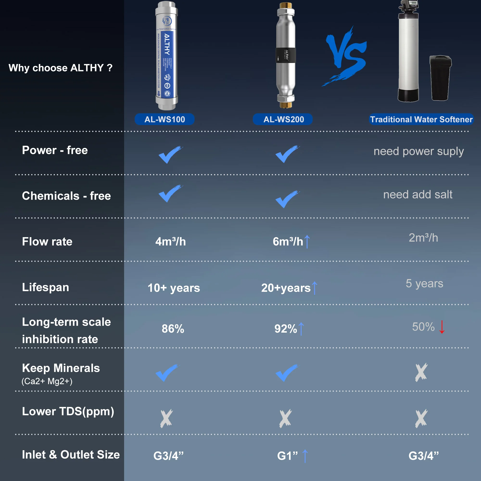●ALTHY New Patented Descaling Technology – IPSE (Ion Polarization System) &SAAS alloy material– LARGE FLOW,POWER-FREE, SALT-FREE, MAINTENANCE-FRR.
