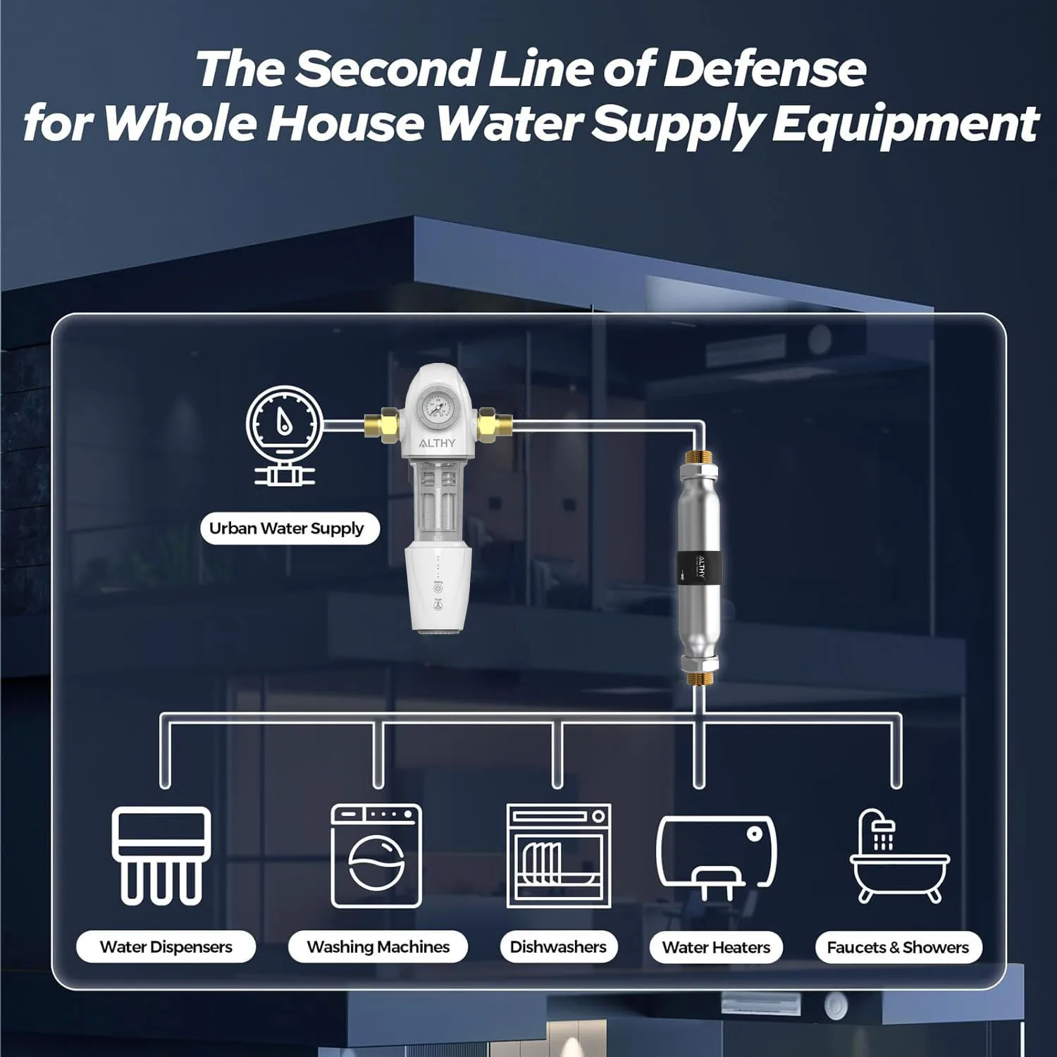• The Whole House Water Descaler Scale Inhibition Softener System enhances water quality by removing limescale and corrosion.