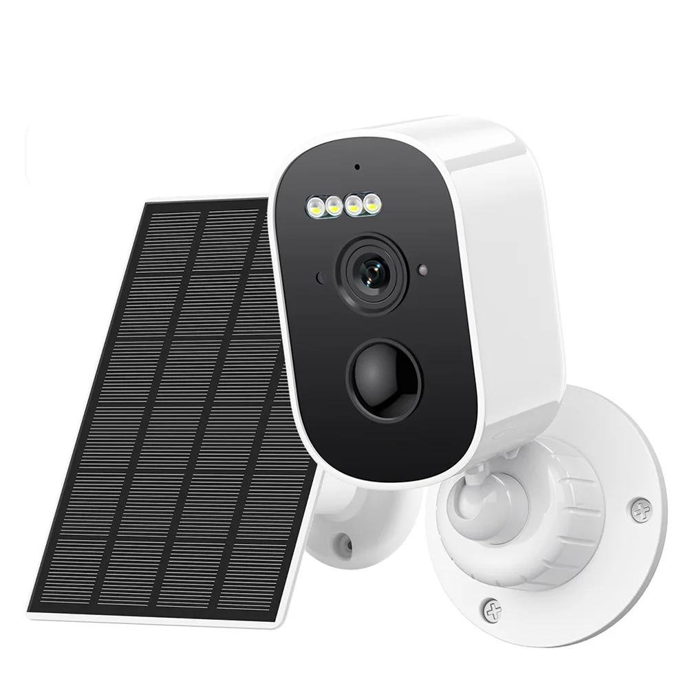 The product is a wireless outdoor security camera that operates using solar power and a battery.